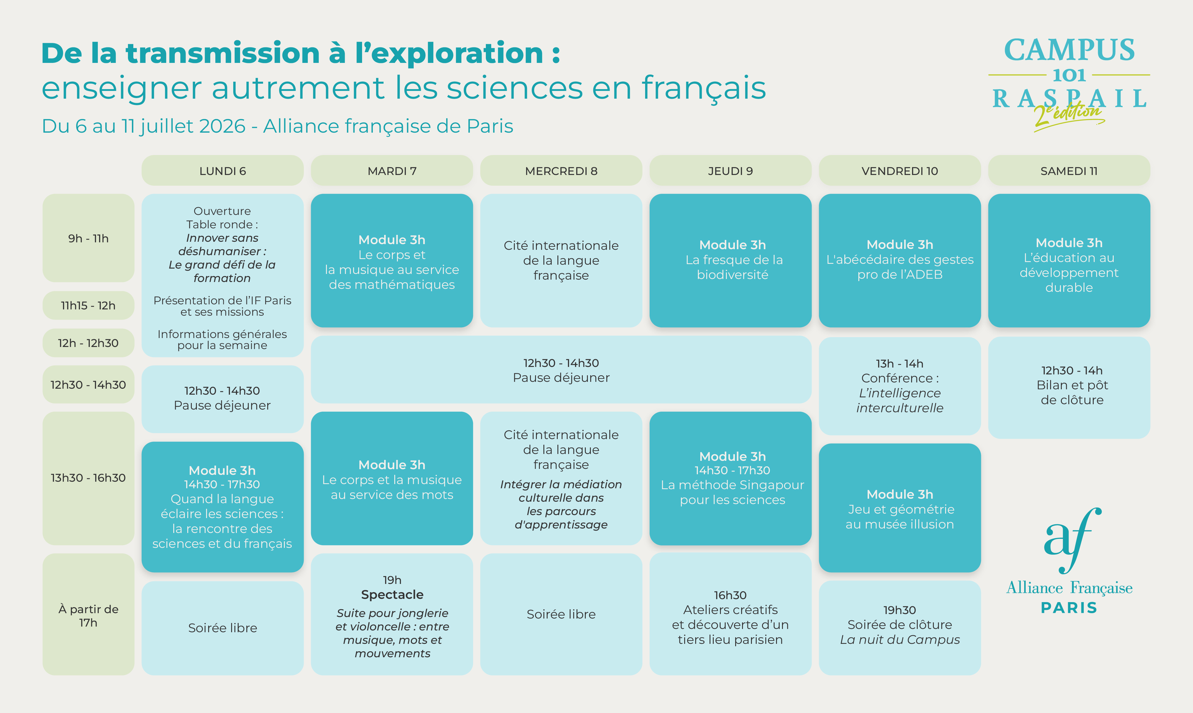 Une semaine immersive dédiée au renouvellement des pratiques d’enseignement des disciplines scientifiques en français qui s’appuie sur une alternance de modules thématiques, d’expérimentations pédagogiques et de temps d’immersion culturelle.