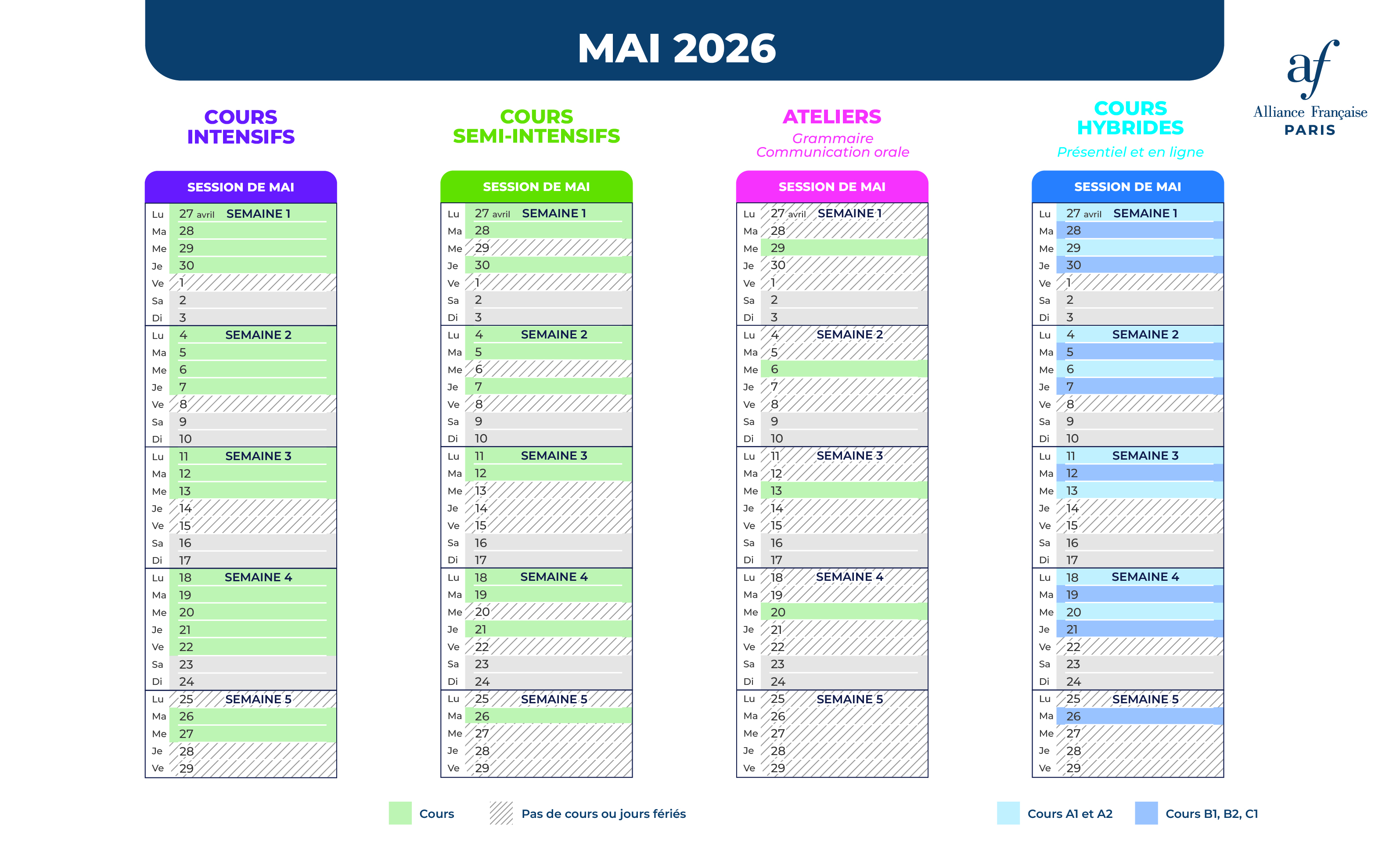 A1 and A2: Monday AND Wednesday from 5 to 7 pm + 2h of personal work // B1 et B2: Tuesday AND Thursday from 5 to 7 pm + 2h of personal work